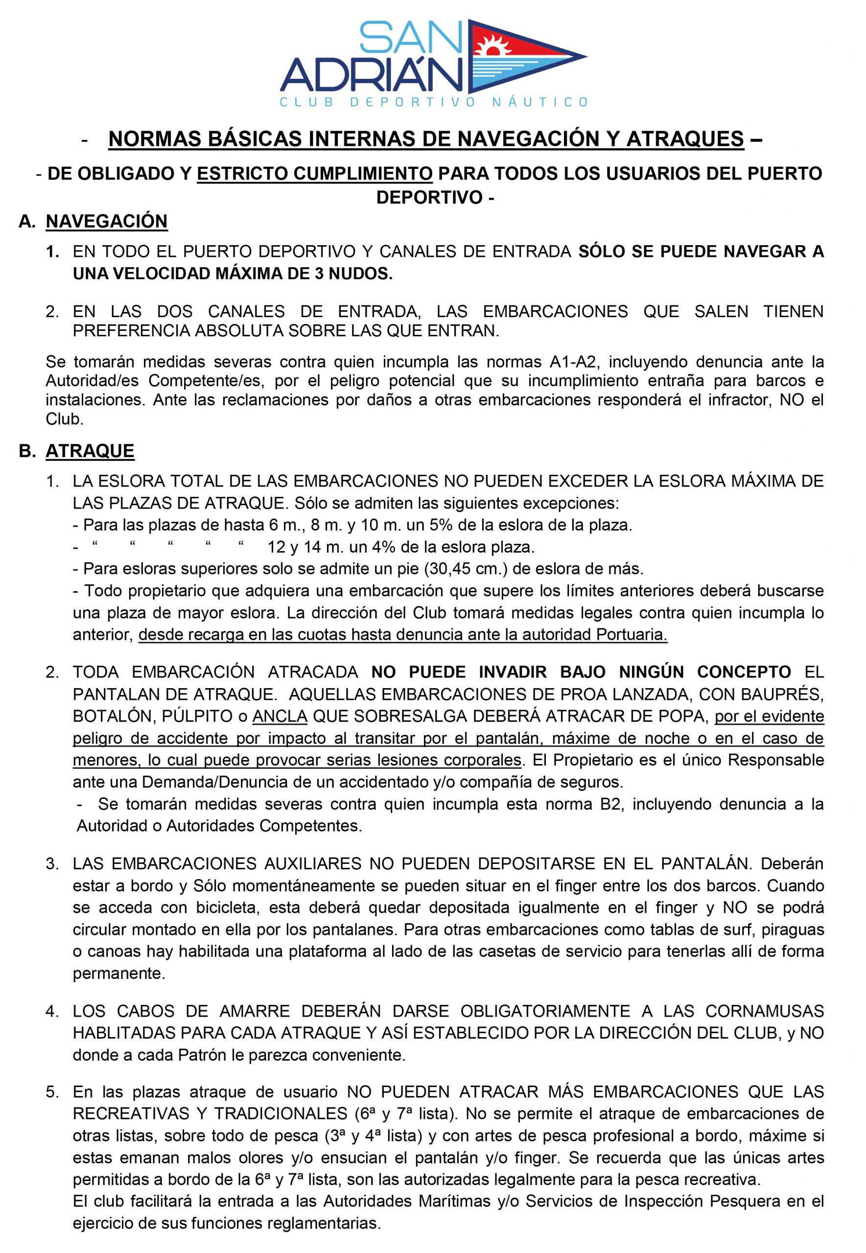 El Puerto Deportivo de San Adrián ofrece un total de 270 plazas de amarre, todas ellas amplias y equipadas con finger para facilitar el atraque y garantizar la comodidad de los usuarios. Los pantalanes tienen un ancho útil de 2,5 m y 3 m, construidos con tornillería de acero inoxidable, lo que asegura su resistencia y durabilidad. Además, las mangas están dimensionadas para adaptarse a cualquier tipo de embarcación deportiva, proporcionando un espacio adecuado y seguro para barcos de diferentes tamaños.